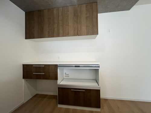 木目がおしゃれなシステムキッチン(食洗機付き)